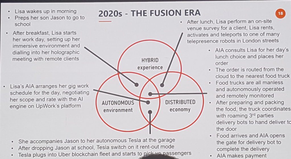 “Goodbye Digital…Hello Fusion” was the topic introduced by Business Futurist, Innovation Strategist and a Disruption Advisor Mr. Charlie Ang. Mr. Ang started off by providing insight on 30 crucial technologies of the next decade like- Artificial Intelligence, IOT, Mobile, Blockchain, Immersive Media etc. What was personally most appealing about the session was a deeper insight on our shift to ‘Fusion Era’, an era that combines the physical, digital and biological spheres. This era as compared to others will evolve at an exponential pace (as compared to linear) and as a result, prove to disrupt every industry at an extremely rapid pace.  In addition, he also classified various technology advancements into 3 different categories namely- Cognitive (Machine learning, AI Personal Assistant, Intelligent Robotics), Trust (Block Chain, Cryptocurrency, Smart Contacts) & Immersive ( AR/VR/MR, Telepresence, Virtual Avatars). All of the above was followed by an exciting example of ‘daily life in the future.’ to show how much more impactful technology will be in managing our day.